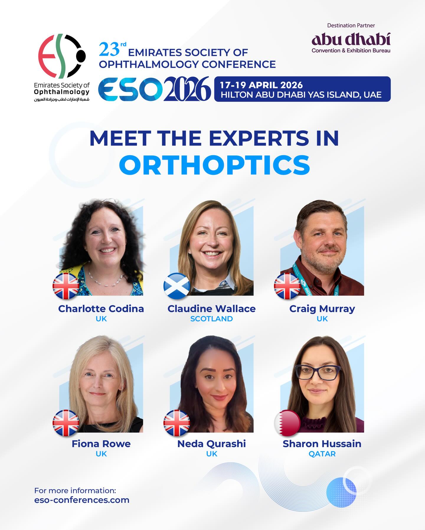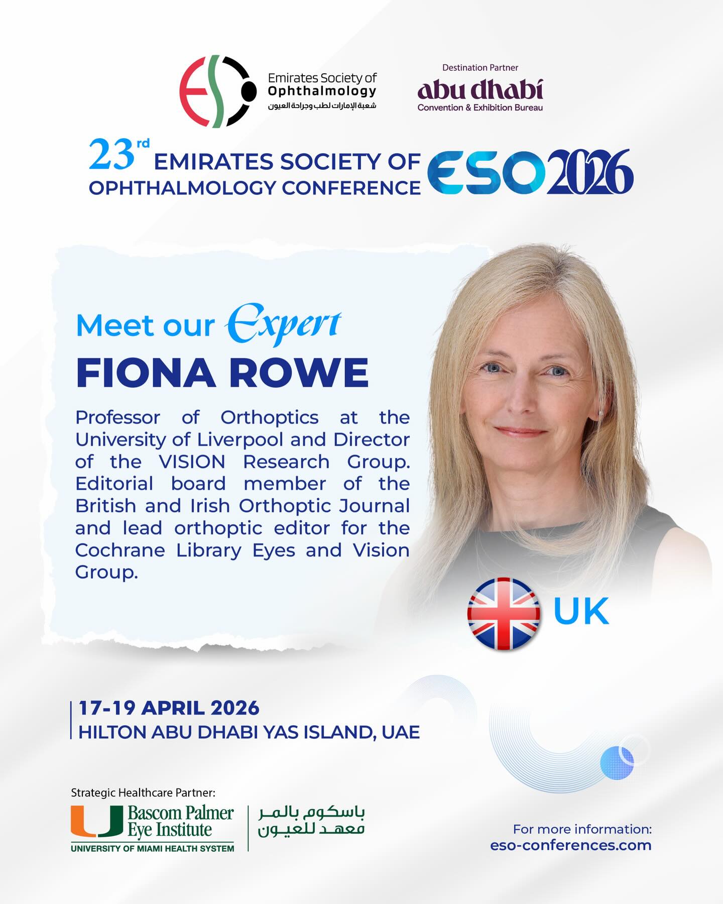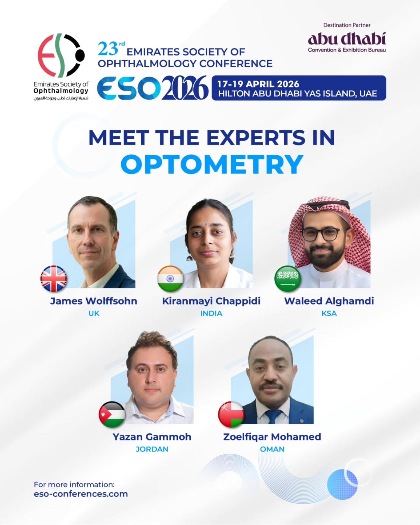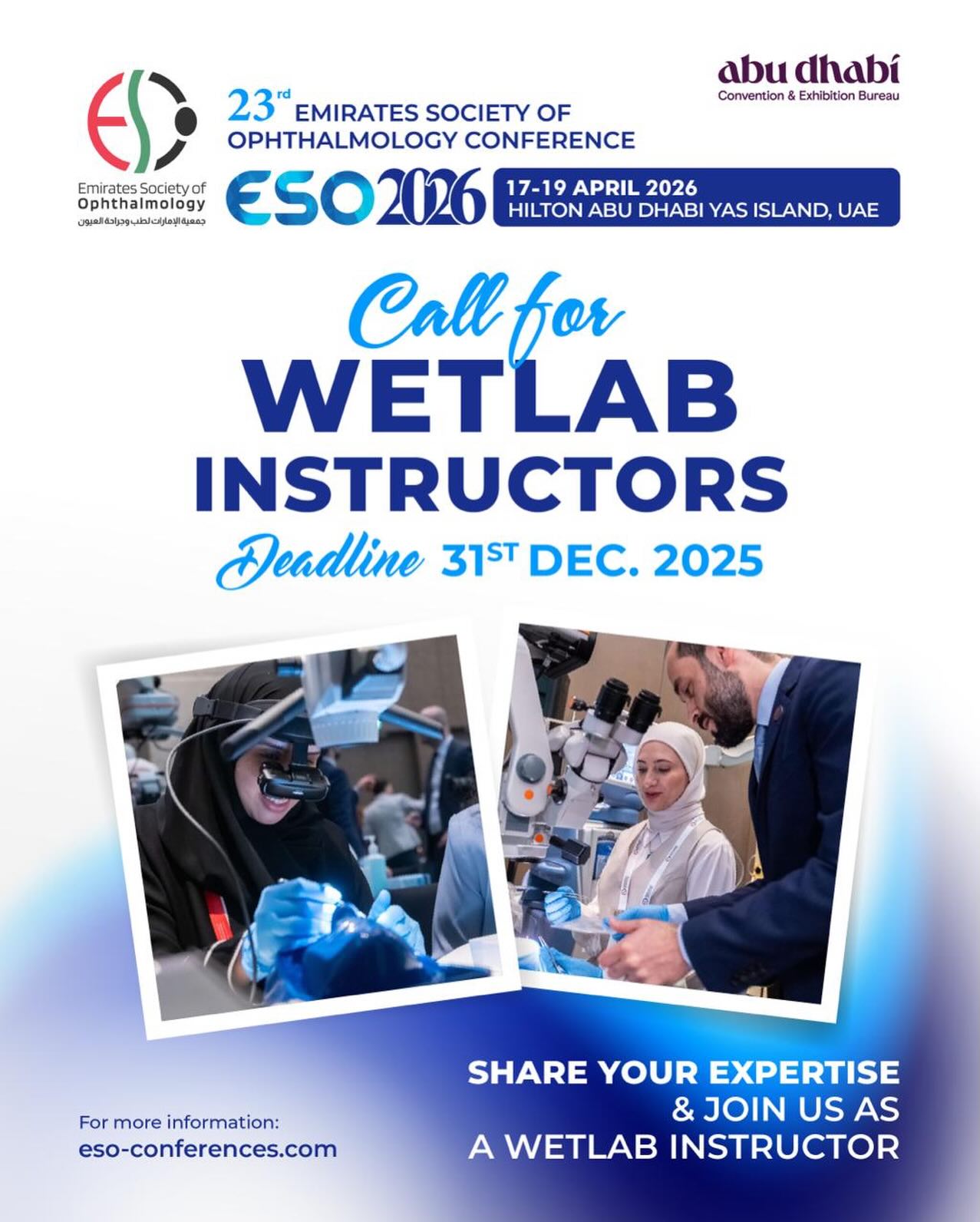 It is with great pleasure and heartfelt enthusiasm that I welcome you to the 23rd Emirates Society of Ophthalmology Conference (ESO 2026), taking place from 17–19 April 2026 in the vibrant capital of the United Arab Emirates, Abu Dhabi.